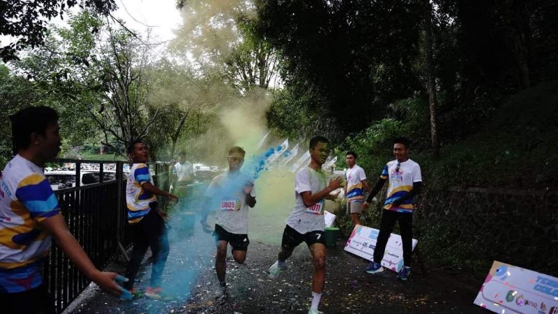 Setelah pengangkatan bendera start oleh Dafip, para peserta memulai lomba lari dengan semarak lemparan bubuk warna-warni ke udara, menciptakan suasana ceria dan penuh semangat.