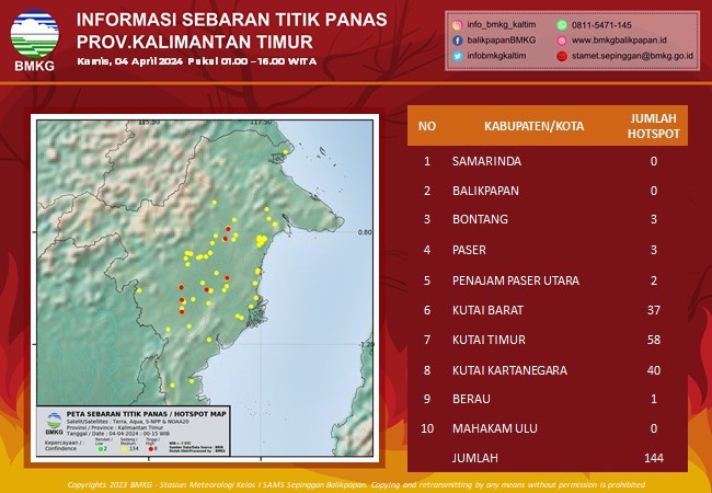 “144 titik hotspot tersebut terpantau berlangsung selama 24 jam,” ungkap Koordinator Bidang Data dan Informasi Stasiun Meteorologi Kelas I Sultan Aji Muhammad Sulaiman (SAMS) Sepinggan BMKG Balikpapan Diyan Novrida melalui pres release, Kamis (4/4).